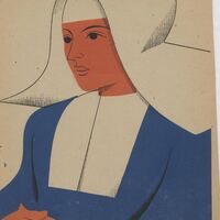 Una monja se ha representado en este dibujo firmado. Sobre su cabeza lleva un gorro blanco y en su vestido destaca el blanco y el azul. La mujer junta las manos en una actitud de piedad.Prueba de imprenta. Ilustración realizada para la revista semanal de Novelas y Cuentos. Titulo: Sor Clemencia. Autor: Enrique Pérez Escrich. Nº publicado (264) pero le corresponde el 864. Fecha: 30-11-1947. Tomo NC. 11.