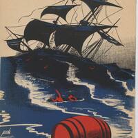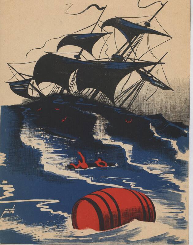 Sobre las aguas azules del mar un barco de color negro ha naufragado como puede adivinarse por diminutos hombres que nadan en las aguas y algún objeto perteneciente al barco como un barril. La composición está firmada.Prueba de imprenta. Ilustración realizada para la revista semanal de Novelas y Cuentos. Titulo: Las inquietudes de Santi Anti Andía. Autor: Pio Baroja. Nº publicado: 798. Fecha: 25-08-1946. Tomo NC.: 17.