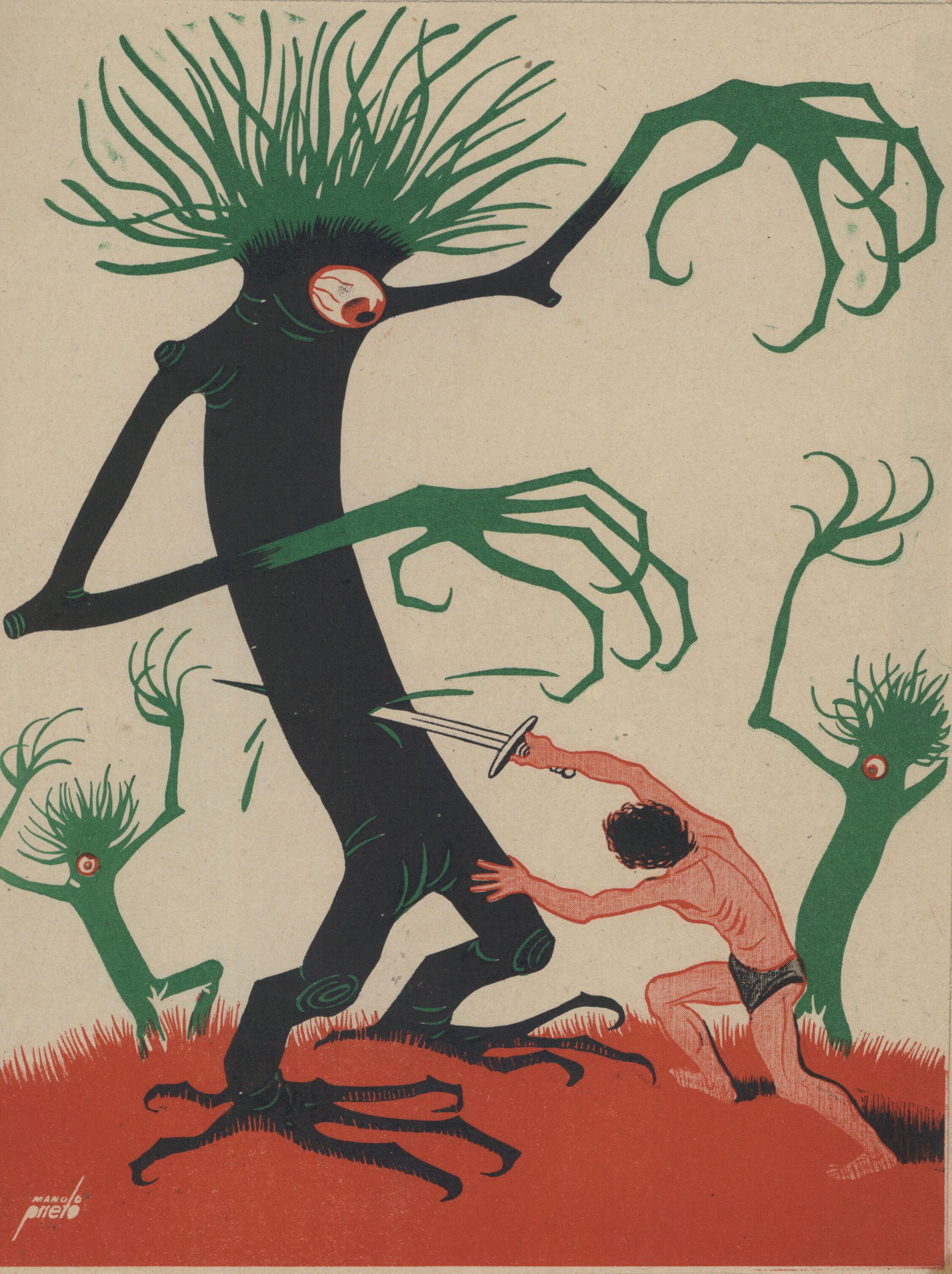 Un hombre lucha ferozmente contra unos árboles peculiares al que se les ha pintado con atributos humanos como brazos, en los que sobresalen grandes garras, y ojos. Dos árboles son verdes y el que se encuentra en primer término es negro. Está presente la firma del pintor en la composición.Prueba de imprenta. iñustracióntración realizada para la revista semanal de Novelas y Cuentos. Titulo: Los dioses de Marte;Autor:Edgar Rice Burroughs; Nº publicado: 825 Fecha: 02/03/47Tomo NC.: