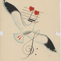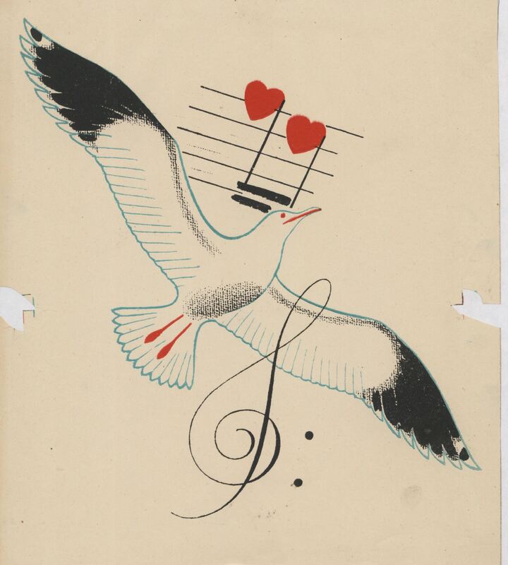 Tres elementos, desordenados en el espacio, configuran este dibujo: una gaviota blanca y negra con la silueta azul, dos notas con forma de corazón rojo sobre un pentagrama y, por último, una clave de sol.Prueba de imprenta. Ilustración realizada para la revista semanal de Novelas y Cuentos. Titulo: Autor: Nº publicado: Fecha: Tomo NC.