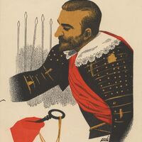 En este dibujo firmado se representa un detalle del famoso episodio de la rendición de Breda. En él un personaje con un traje negro, con una banda roja sobre su pecho y una gola en el cuello acepta una llave que le entregan. En su rostro de semblante pacífico crece una barba castaña. Por detrás de esta figura se adivinan algunas lanzas grises.Prueba de imprenta. Ilustración realizada para la revista semanal de Novelas y cuentos. Titulo: Autor: Nº publicado: Fecha: Tomo NC.