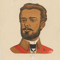 En el centro de este dibujo se ha realizado el retrato de un personaje con la mirada muy directa y con el semblante serio. Lleva una chaqueta roja con adornos dorados y sobre ella se puede vislumbrar la firma del pintor en color blanco. En su rostro le crece una barba castaña, del mismo color que su pelo.Prueba de imprenta. Ilustración realizada para la revista semanal de Novelas y Cuentos. Titulo: Autor: Nº publicado: Fecha: Tomo NC.