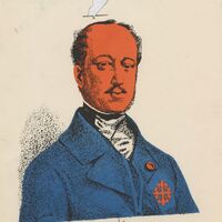 Se ha realizado en este retrato firmado el busto de un hombre con el traje azul, sobre el que se ve el detalle de un escudo rojo, y con camisa blanca. En su rostro destaca un fino bigote. La figura mira hacia el frente.Prueba de imprenta. Ilustración realizada para la revisgta semanal de Novelas y Cuentos. Titulo: Autor: Nº publicado: Fecha: Tomo NC.
