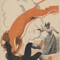 Una mujer que surge en segundo plano y al ver que un hombre es atacado por un león marrón coge una pistola que dispara contra el animal. Dicha mujer lleva un vestido largo gris y un sombrero sobre su cabeza. El hombre lleva un traje negro. En el dibujo se aprecia la firma del pintor.Ilustración realizada para la revista semanal de Novelas y cuentos. Titulo: Clovis Dardentor; Autor: Julio Verne;Nº publicado: 812; Fecha:01/12/46; Tomo NC.:No