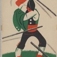 En el centro de esta composición firmada aparece la figura de un hombre con un palo en ristre. Lleva un pantalón negro, medias blancas, camisa también blanca y un chaleco verde y negro. Sus botas son marrones y sobre su cabeza lleva un sombrero negro. se ven en el dibujo otros dos palos.Prueba de imprenta. Ilustración realizada para la revista semanal de Novelas y Cuentos. Titulo: La aldea perdida. Autor: A. Palacios Valdés. Nº publicado: 816. Fecha: 29-12-1946. Tomo NC.: