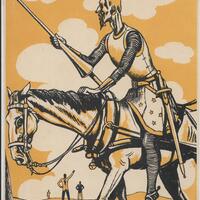 El caballero Don Quijote de La Mancha está representado en el centro de este dibujo en el que también está presente la firma del pintor. El caballero español va sobre un caballo y sosteniendo su lanza. En segundo plano unas figuras le saludan. Destacan los colores amarillo y blanco en toda la composición.Prueba de imprenta. Ilustración realizada para la revista semanal Novelas y Cuentos. Titulo: Autor: Nº publicado: Fecha: Tomo NC.: