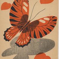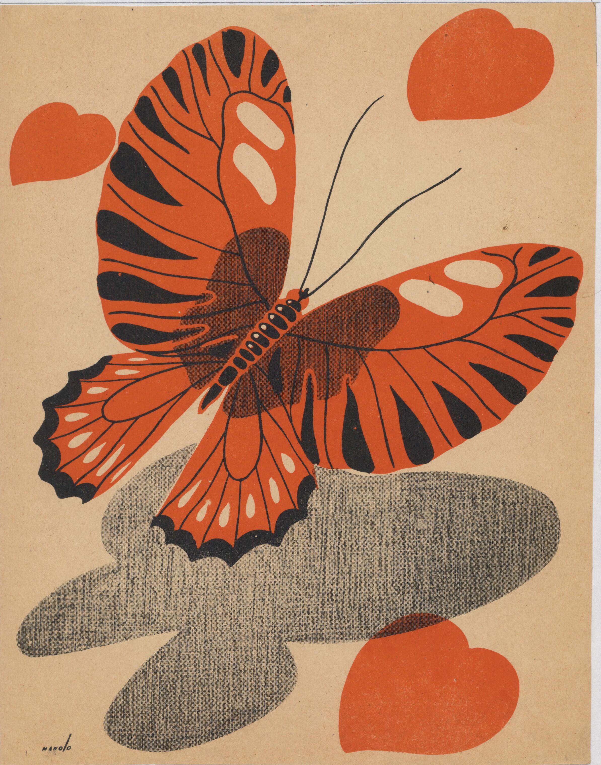 En este dibujo firmado por su autor destaca la imagen de una mariposa roja, blanca y negra creando una sombra gris sobre el suelo que sobrevuela y destacan, a su alrededor, tres corazones rojosPrueba de imprenta. Ilustracion realizada para la revista semanal Novelas y Cuentos. Titulo: Autor: Nº publicado: Fecha: Tomo NC.: