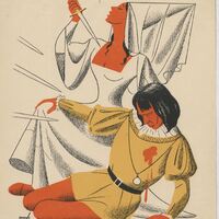 Un hombre con el traje rojo y amarillo yace en el suelo con una herida en el pecho de la que emana sangre. Detrás de él una mujer con un vestido y un cono como sombrero blancos alza un puñal para clavárselo en su pecho. La firma del artista está presente en esta representación.Prueba de imprenta.. Ilustración realizada para la revista semanal Novelas y Cuentos. Titulo: Macías y el conde Fernán González. Autor: Marianmo José de Larra. Nº publicado: 955. Fecha: 28-08-1949. Tomo NC.: 18