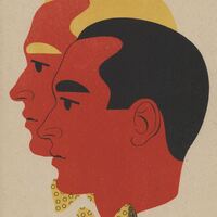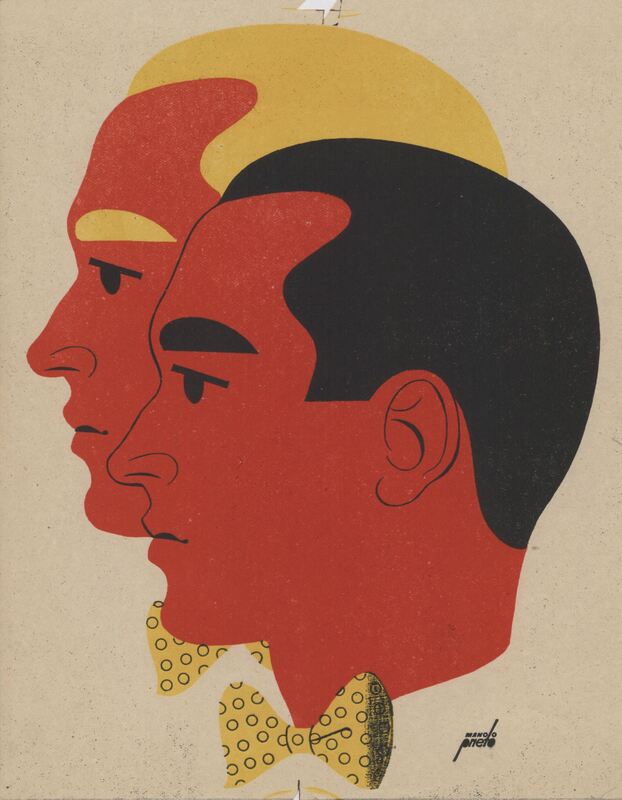 Dos hombres de perfil aparecen en la escena de este dibujo en el que se vislumbra la firma del pintor. En primer hombre tiene el pelo negro como también su ceja y el segundo tiene el pelo amarillo con la ceja también amarilla. Ambos llevan pajarita amarilla con bolas negrasPrueba de imprenta. Ilustración realizada para la revista semanal Novelas y Cuentos. Titulo: Autor: Nº publicado: Fecha: Tomo NC.: