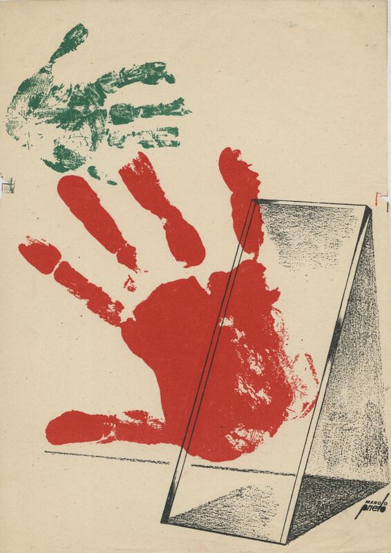 - Sobre un fondo claro destacan las huellas de dos manos: una roja y otra verde. También destaca en el dibujo firmado una figura geométrica perece un cristal rectángulo apoyado en la pared.Prueba de imprenta. Ilustración realizada para la revista semanal Novelas y Cuentos. Titulo: Autor: Nº publicado: Fecha: Tomo NC.: