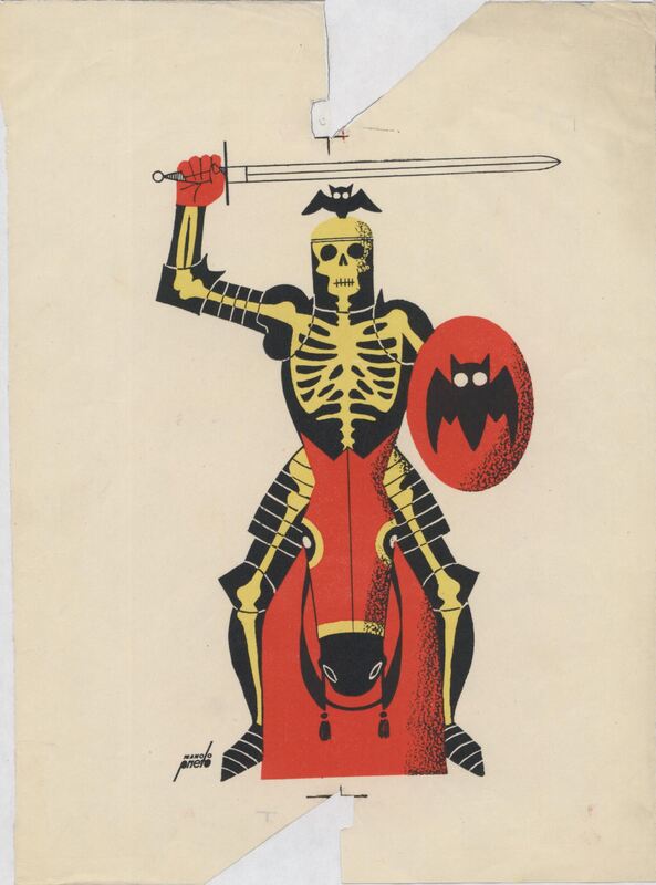 Sobre un caballo cubierto con una manta roja y del que se ven sus ojos se aprecia la figura de un esqueleto con los huesos amarillos blandiendo una espada en su mano derecha mientras que con su mano izquierda sostiene un escudo rojo sobre el que hay dibujado en negro un murciélago. El dibujo está firmado.Prueba de imprenta. Ilustración realizada para la revista semanal Novelas y Cuentos. Titulo: El castillo Peligroso. Autor: Walter Scott. Nº publicado: 1182. Fecha: 03-01-1954. Tomo NC.: 46