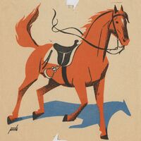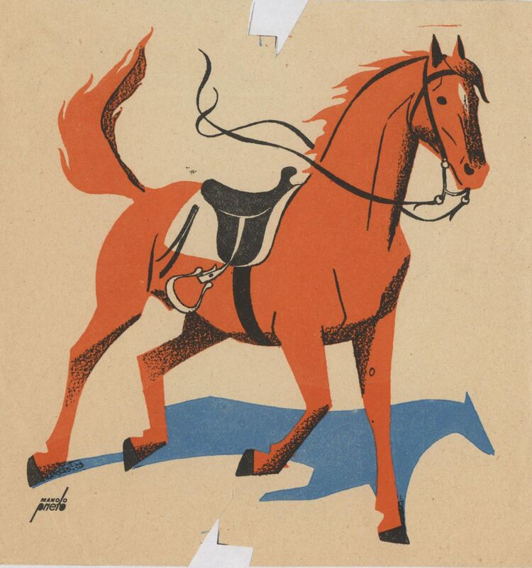 - En el centro de esta composición firmada por el artista se encuentra un caballo marrón corriendo sin jinete sosteniendo sobre su lomo una silla de montar negra.Prueba de imprenta. Ilustración realizada para la revista semanal Novelas y cuentos. Titulo: Autor: Nº publicado: Fecha: Tomo NC.: