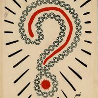 En el centro de la composición firmada destaca como único elemento el signo de un punto de interrogación realizado a base de círculos pequeños y azules y en su interior una línea roja. De la figura se desprenden destellos de color negro.Prueba de imprenta. Ilustración realizada para la revista semanal Novelas y cuentos. Titulo: Autor: Nº publicado: Fecha: Tomo NC.: