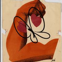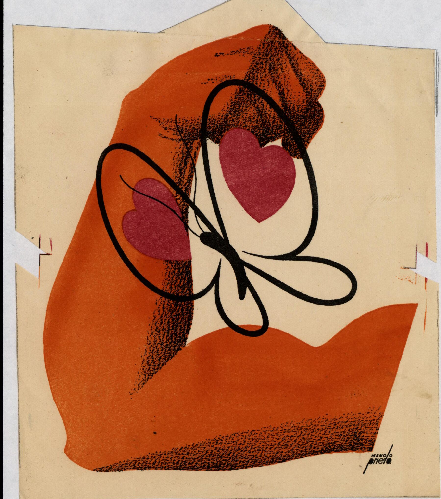 - En esta composición firmada destacan dos figuras: un gran brazo de color marrón resaltando sus músculos y una mariposa de silueta negra con un corazón rojo en cada una de sus alas transparentes.Prueba de imprenta. Ilustración realizada para la revista semanal Novelas y Cuentos. Titulo: Autor: Nº publicado: Fecha: Tomo NC.: