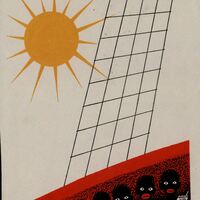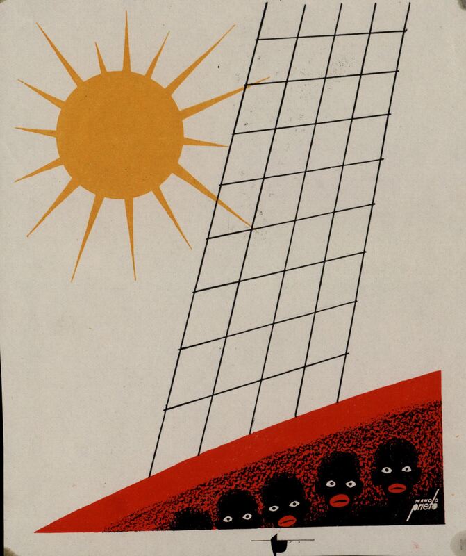 - En un cielo claro en el que brilla un intenso sol se ve el detalle de un barco rojo en el que se esconden algunos hombres negros de grandes ojos blancos y bocas de labios gruesos y rojos. El dibujo está firmadoPrueba de imprenta. Ilustración realizada para la revista semanal Novelas y Cuentos. Titulo: Autor: Nº publicado: Fecha: Tomo NC.: