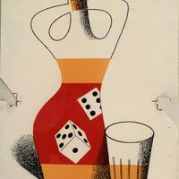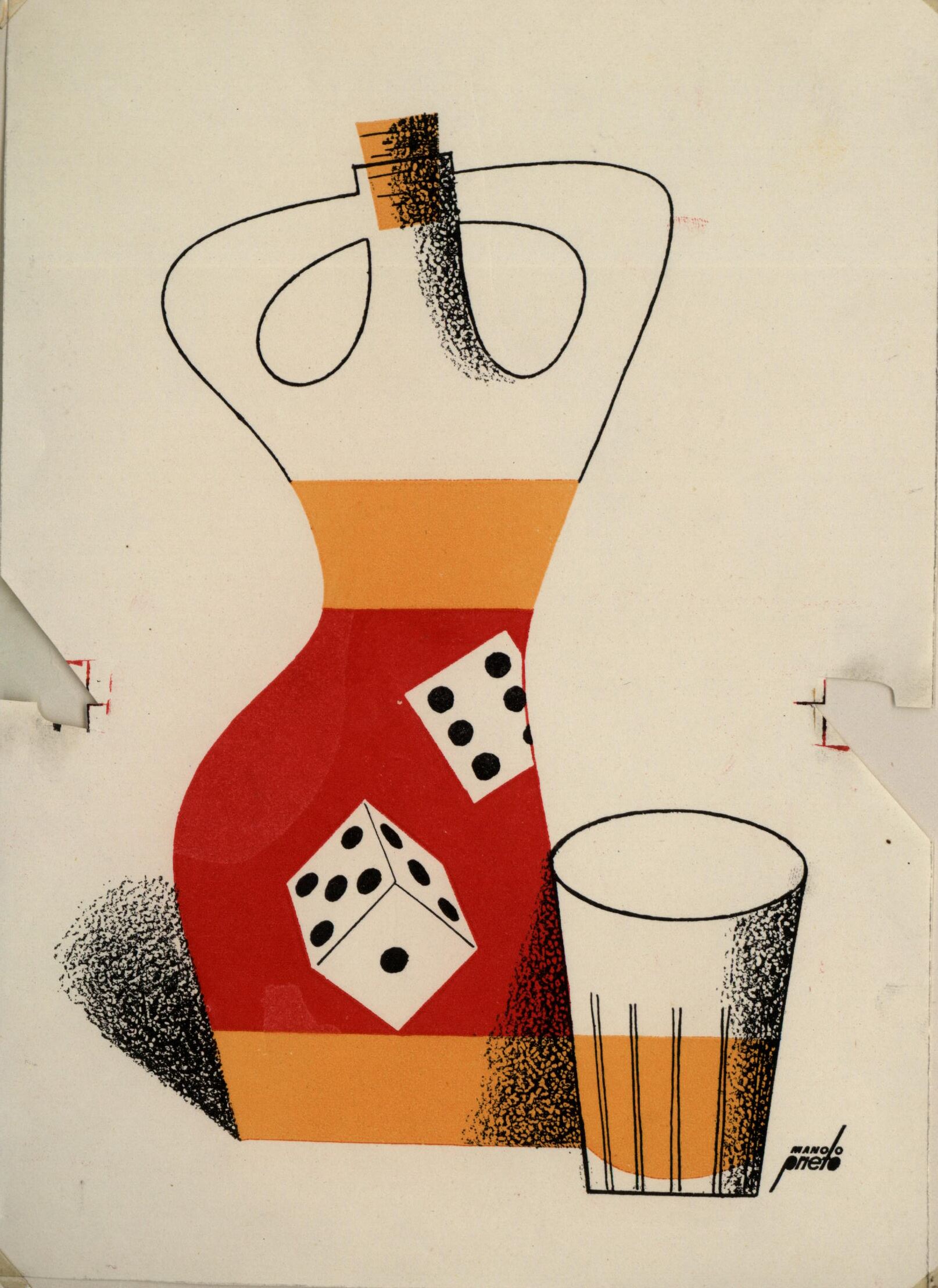 En el centro de esta imagen firmada se han representado una botella con una silueta ondulante y de color amarillo y rojo con dos dados de juego. A su lado hay un vaso con un líquido amarillo.Prueba de imprenta. Ilustración realizada para la revista semanal Novelas y Cuentos. Titulo: “ Mujeres … “. Autor: Paul Kork. Nº publicado: 1168. Fecha: 27-09-1953 Tomo NC.: 42