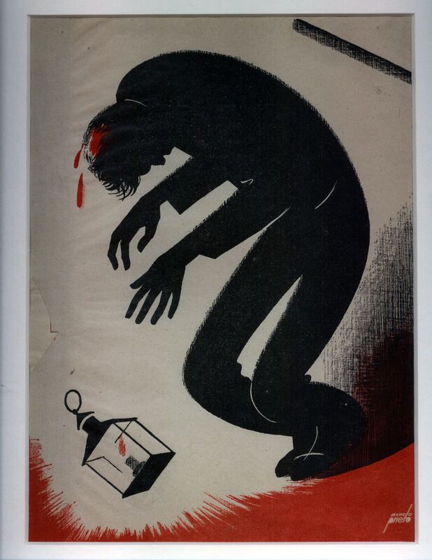 En este dibujo enmarcado, en el que está presente la firma del pintor en la esquina inferior de la izquierda, se ha dibujado la imagen de un hombre con el traje negro que al ser golpeado en la cabeza deja caer una linterna encendida al suelo. De su cabeza brota una mancha roja de sangre y en la parte superior , a la izquierda, se adivina el arma del crimen, un palo.Prueba de imprenta. Ilustración realizada para la revista semanal de Novelas y Cuentos. Titulo: Se ha cometido un crimen. Autor: Alberto Boissiére. Nº publicado: 824.Fecha: 23-02-1947. Tomo NC.: 18.