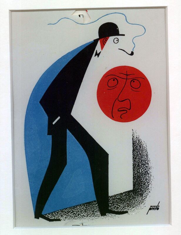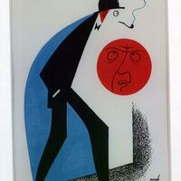 En este dibujo enmarcado destaca la figura de perfil de un hombre muy estilizado fumando una pipa y con un traje y sombrero negros. Por detrás de la espalda lo envuelve una atmósfera de color azul. Delante de su figura destaca una circunferencia roja en cuyo interior se ha dibujado una cara que observa al fumador. En la esquina inferior de la izquierda está presente la firma del artista.Prueba de imprenta. Ilustración realizada para la revista semanal de Novelas y Cuentos. Titulo: Los espectros del Castillo. Autor: Pío Baroja. Nº publicado: 1147. Fecha: 03-05-1953. Tomo NC.: 59
