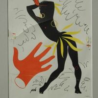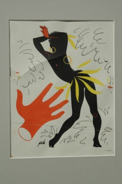 Una mano pintada de rojo, una bailarina negra con falda de tiras amarillas y alrededor de los dibujos unas rayas representando la selva, a la altura del pecho izquierdo un circulo amarillo y sobre la cabeza unas ramas amarillas, el pecho derecho un punto rojo. La firma en la parte inferior izquierda.Prueba de imprenta. Ilustración realizada para la revista semanal de Novelas y Cuentos. Titulo: La novela de Spahi; Autor: Pierro Lotti; Nº de Orden: 1238; Fecha: 30-01-55; Tomo NC.: 4