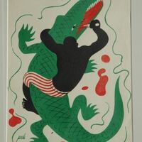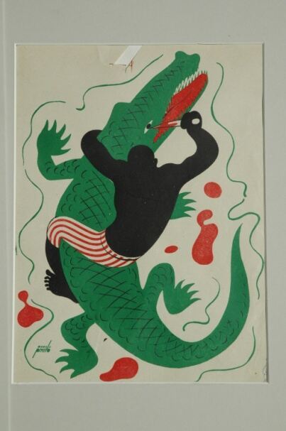 Un gran caimán pintado de verde, negro y rojo, un negro subido en cima del caimán con un cuchillo clavándoselo en la boca, este hombre está pintado de negro pantalones a rayas blancas y rojas el agua representado por unas líneas curvas pintadas en verde sobre el agua unas manchar rojas . La firma en la parte inferior izquierda.Prueba de imprenta. Ilustración realizada para la revista semanal de Novelas y Cuentos. Titulo: La venganza del amarillo; Autor: Mayne Reid Nº publicado: 894; Fecha: 27-06-48 Tomo NC. 02 - revista Si