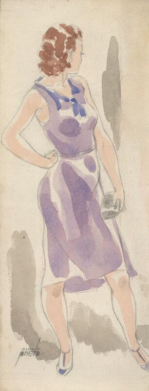 - Figura de una mujer de frente al espectador cuya cabeza está vuelta hacia la sombra proyectada en la pared, lleva un traje en tonos violetas y en una de sus manos sujeta un pequeño bolso oscuro.