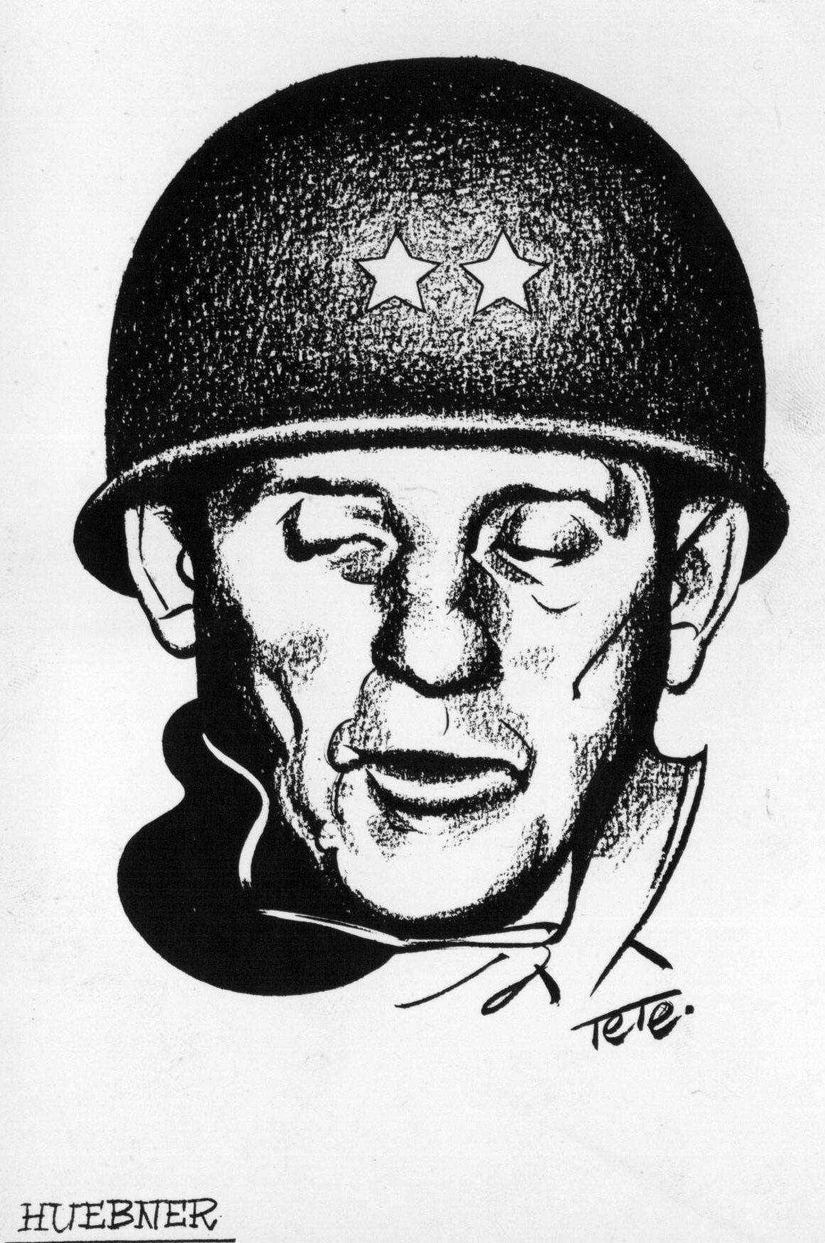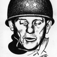 - Imagen en primer término de la cabeza de un militar con un casco con dos estrellas, que corresponden al rango de general, de rasgos marcados, mirando de reojo y con un gesto en la boca de ironía.
