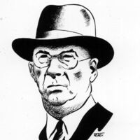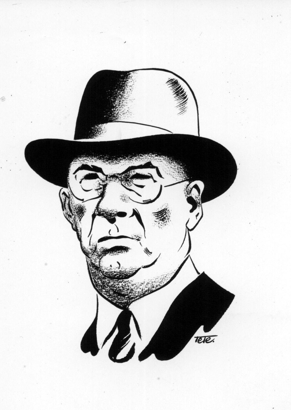 - Imagen de un retrato perteneciente a un caballero maduro, vestido con traje, corbata, con gafas y sombrero de ala, por su atuendo y complementos situaríamos al caballero en la época de los años 50. Es posible que tenga que ver con algún personaje importante en la II Guerra Mundial.