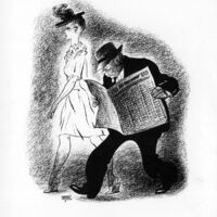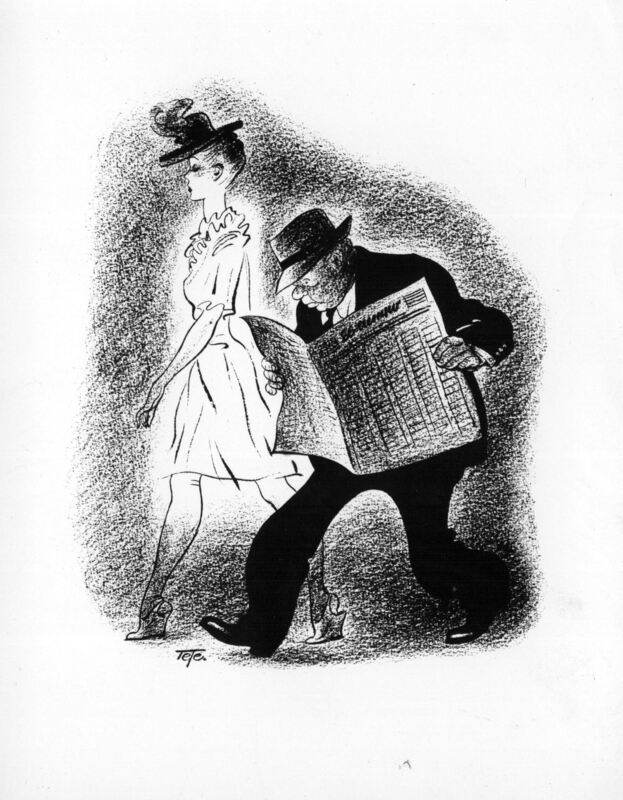 - Escena compuesta por la figura de una mujer alta, esbelta con traje blanco y sombrero y a su lado un hombre mayor con traje y sombrero andando junto a ella mientras lee el periódico.