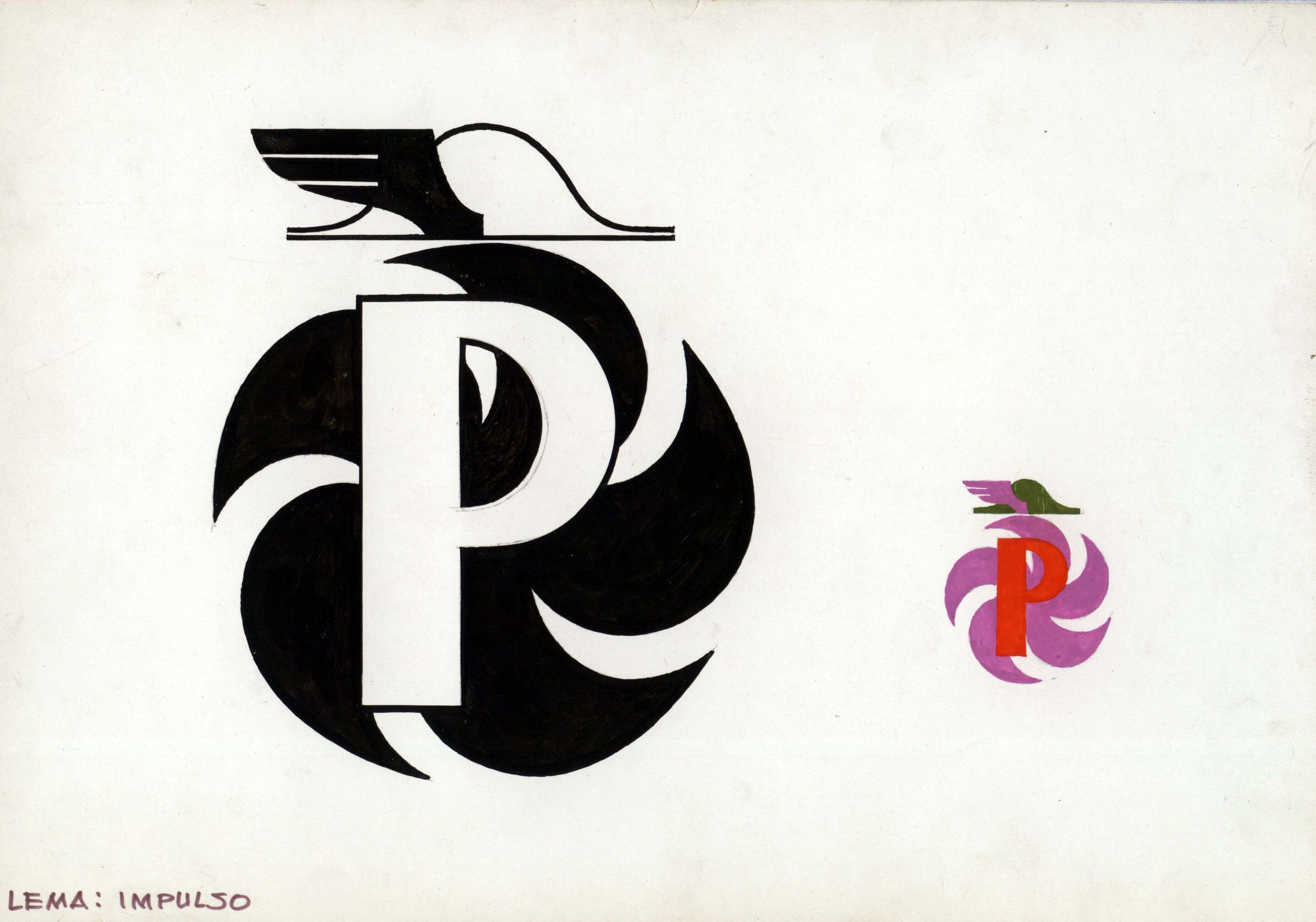 - Bajo el lema de “impulso” se han dibujado dos “p” sobre un fondo blanco. La de la derecha, en blanco y negro, es de mayor tamaño que la roja y morada de la izquierda. El soporte es rectangular.