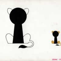 - Sobre un fondo blanco se han dibujado a dos gatos sentados y de espalda. El de la derecha, blanco y negro, es de un tamaño mayor que el de al izquierda, negro y marrón. La forma del soporte es rectangular y en letras rosas se ha titulado el dibujo como guardián.
