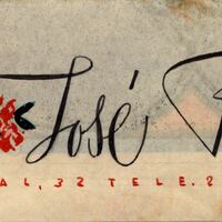 - Con el nombre de José Ripoll en color negro y en letra caligráfica se anuncia en este cartel comercial una tienda especializada en flores artificiales. Destaca sobre el soporte rectangular, a la derecha, un cesto con flores rojas. La dirección del centro se da en la parte inferior con letra muy pequeña y en color rojo.