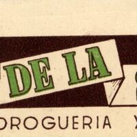 - En este cartel comercial se anuncia una droguería y una perfumería bajo el nombre de Juan de la serna, en letras mayúsculas y verdes sobre un fondo blanco y negro. A la derecha destacan unas botellas en tonos verdes, blancos y negros.
