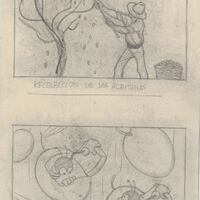 - Se han representado dos dibujos enmarcados. En el primero un hombre agita unas ramas de las que se desprenden las aceitunas. En el segundo unos insectos salen de las aceitunas. Destaca el color gris en los dibujos entre los que se encuentra el lema.