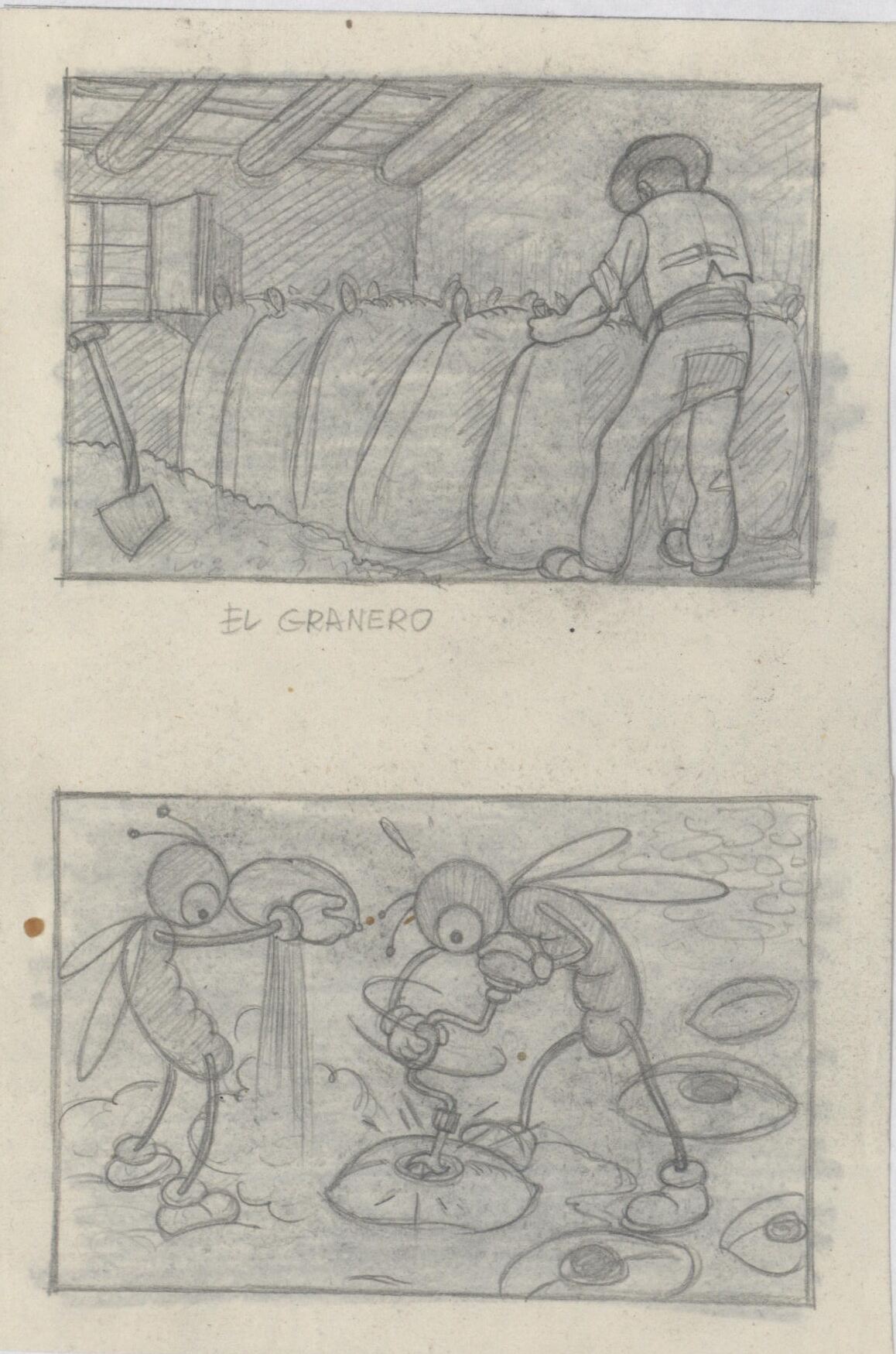 - Se pueden apreciar dos dibujos cada uno en su enmarque. En el primero se ve a un hombre en un granero ordenando las bolsas del grano y en el segundo a unos insectos con unos granos. Predominan en el dibujo los colores grises y el lema se coloca en medio de los dos dibujos.