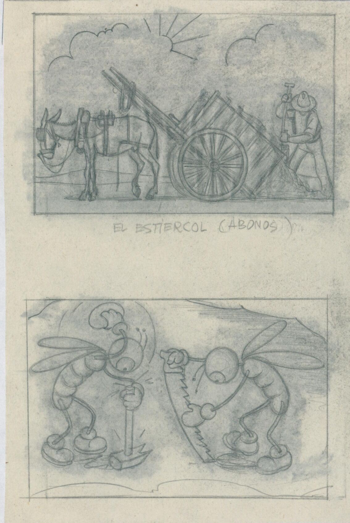 - En esta composición destacan dos dibujos enmarcados en tonos grises. En el primero un hombre deja caer de su carro el estiércol para abono de sus campos. En el segundo unos insectos trabajan el suelo. El lema se sitúa entre los dibujos.
