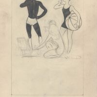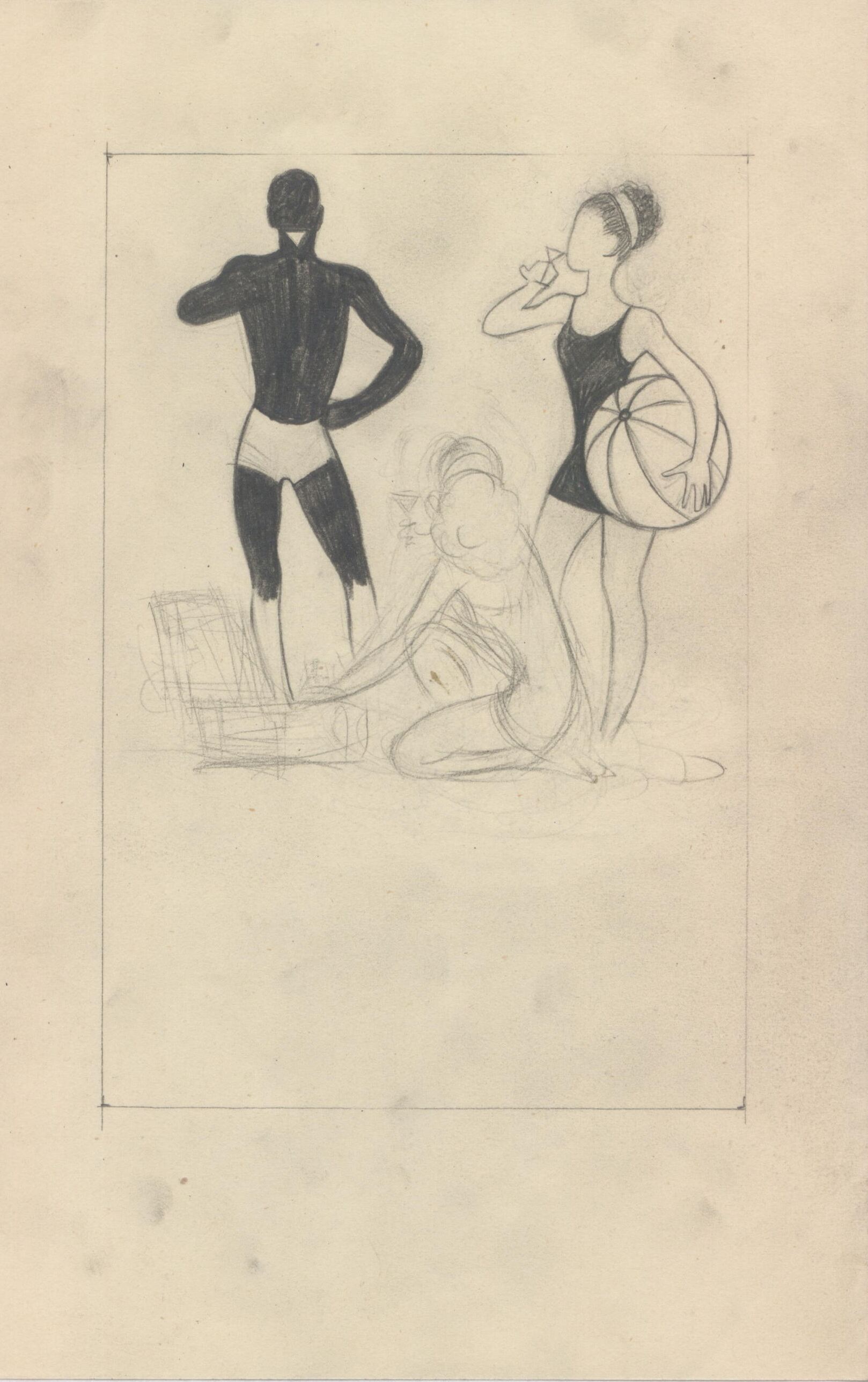 - En este dibujo enmarcado en donde destacan las líneas de color negro sobre un fondo blanco grisáceo se han representado tres figuras: dos chicas, una de pie con una pelota y otra agachada, y un chico negro. Las tres figuras que visten traje de baño parecen descansar de los juegos y tomar algo de bebida.