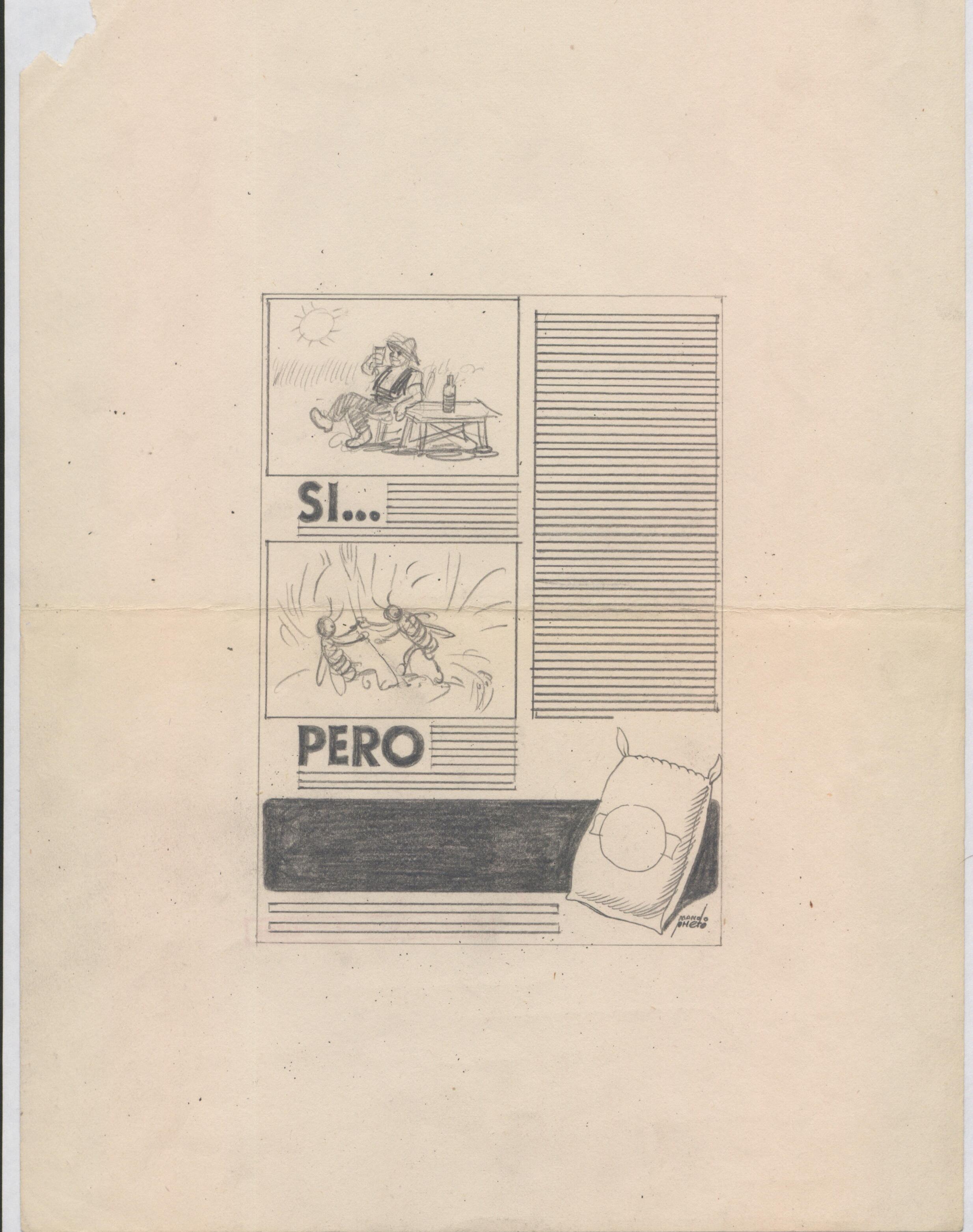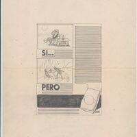 En esta composición se puede apreciar en la parte inferior la firma del pintor, en la esquina de la izquierda, como una franja horizontal, gruesa y de color negro sobre la que está dibujado un saco blanco. En al parte superior se ve un dibujo enmarcado bajo el lema “si” en el que un hombre descansa y debajo otro dibujo enmarcado con el lema “pero”. Predominan las líneas horizontales a la derecha, entre los dibujos y bajo la franja negra, como el color negro sobre un fondo blanco.