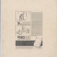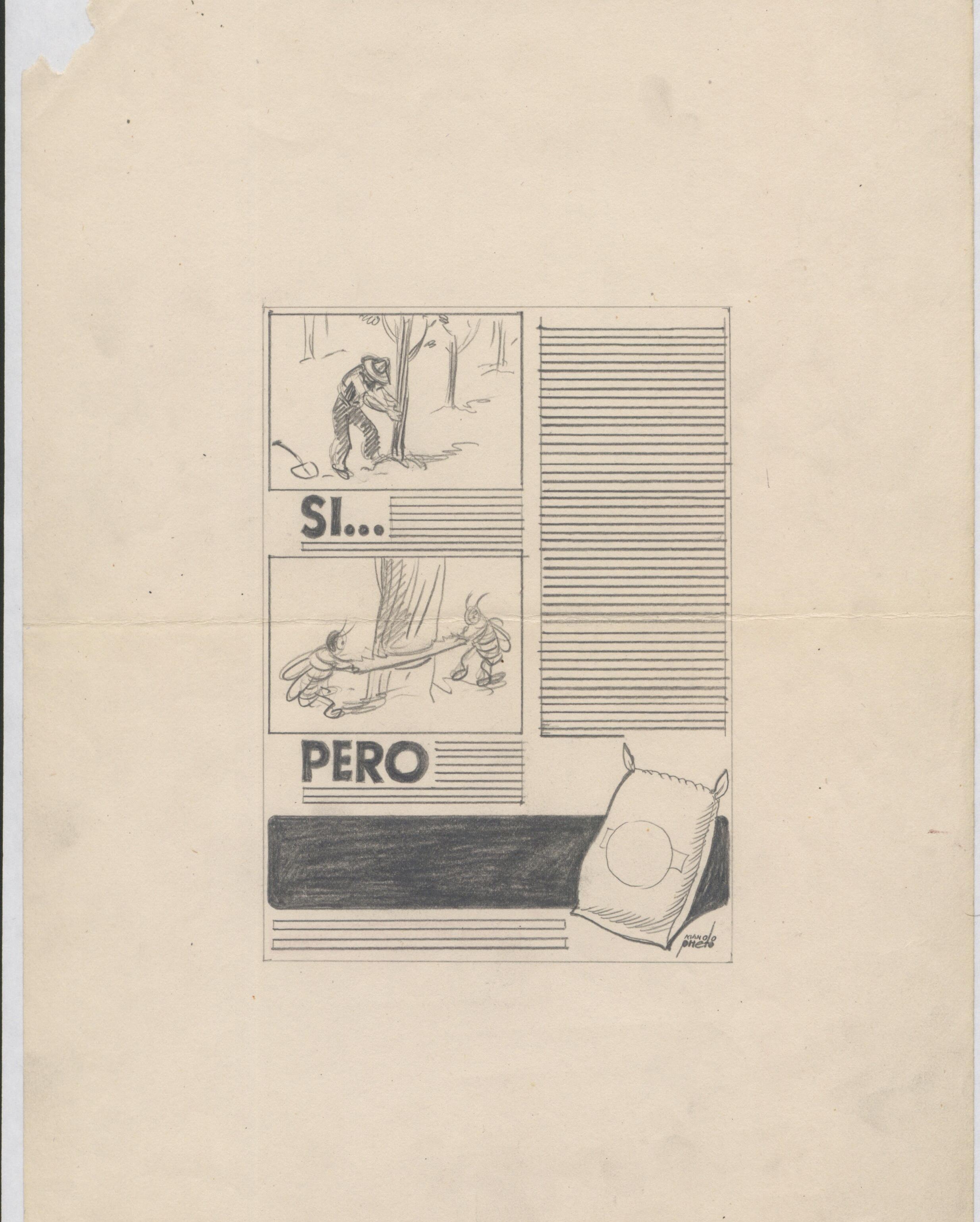 En el boceto de este cartel se pueden apreciar dos dibujos. En la parte superior bajo el lema de “si” se ve a un hombre plantando un árbol y por debajo se ve el dibujo de unos insectos serrando un árbol bajo el lema de “pero”. En la parte inferior destaca una franja negra, gruesa y horizontal sobre la que se ha dibujado un saco blanco. En toda la composición destacan líneas rectas horizontales, a la izquierda, entre los dos dibujos y bajo la franja negra. Predominan líneas oscuras sobre un fondo claro. Está presente la firma del pintor en la esquina de la izquierda en la parte inferior.