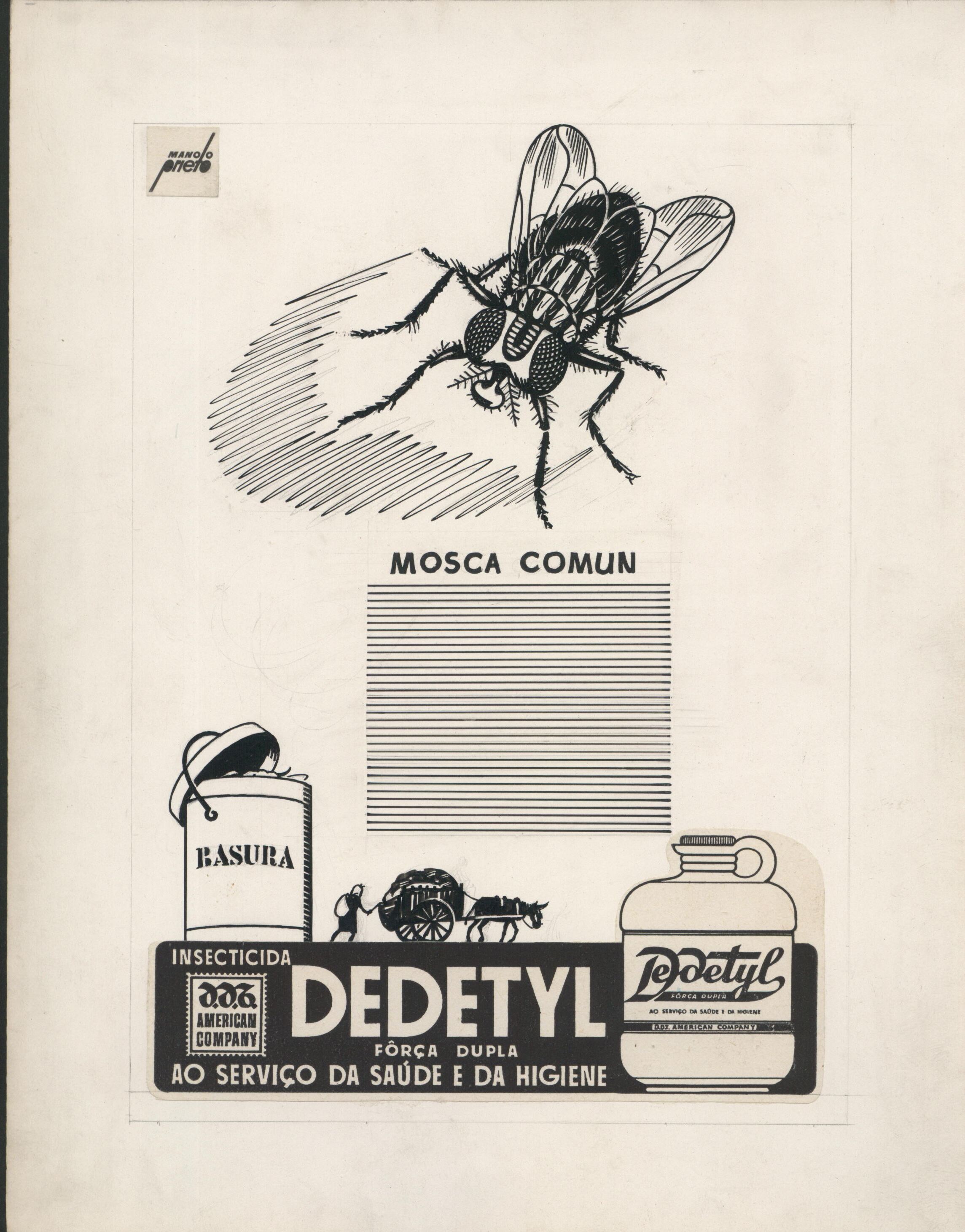 - En este cartel publicitario se anuncia, en la parte inferior, un producto llamado “dedetyl” que lucha contra los insectos como el que se puede apreciar en el centro en color negro, la mosca común. Destacan las líneas negras sobre un fondo claro como también la firma del pintor en la parte superior de la derecha.