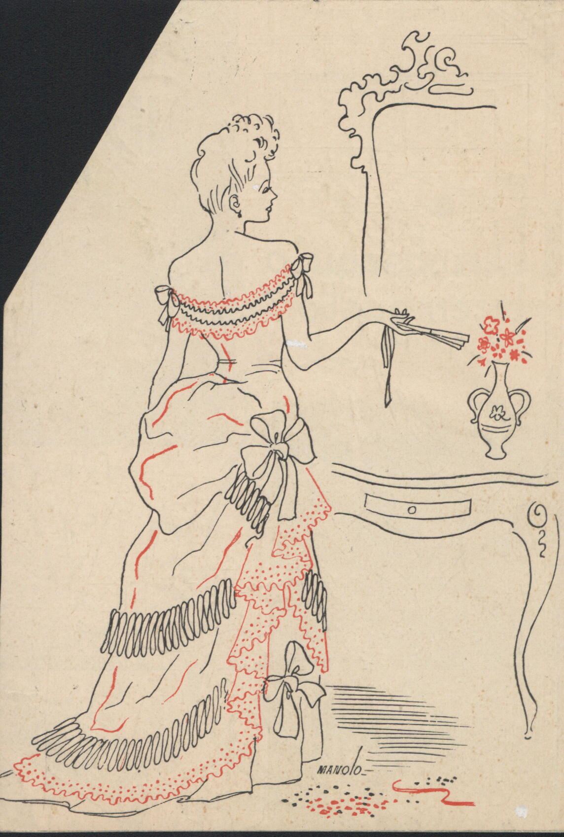 - Dibujo a lápiz negro y rojo, con la imagen de una mujer vestida de época de espaldas al espectador, sujetando un abanico en su mano frente a un tocador con jarrón de flores rojas y la silueta de un espejo.