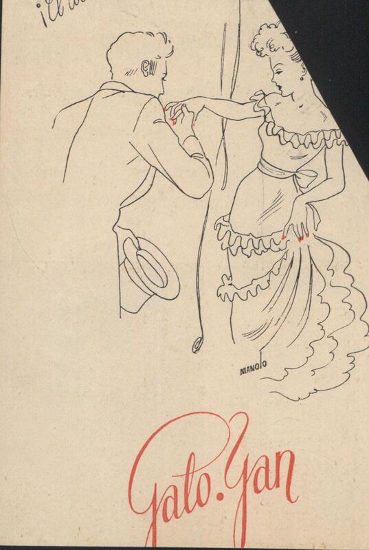 - Dibujo a lápiz negro que perfila las siluetas de los personajes que componen la escena, que representa a un caballero de espaldas besando la mano de una mujer vestida de época, con la presencia del rojo en las uñas de la mujer y el letrero que da nombre al dibujo.