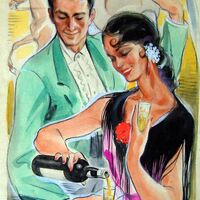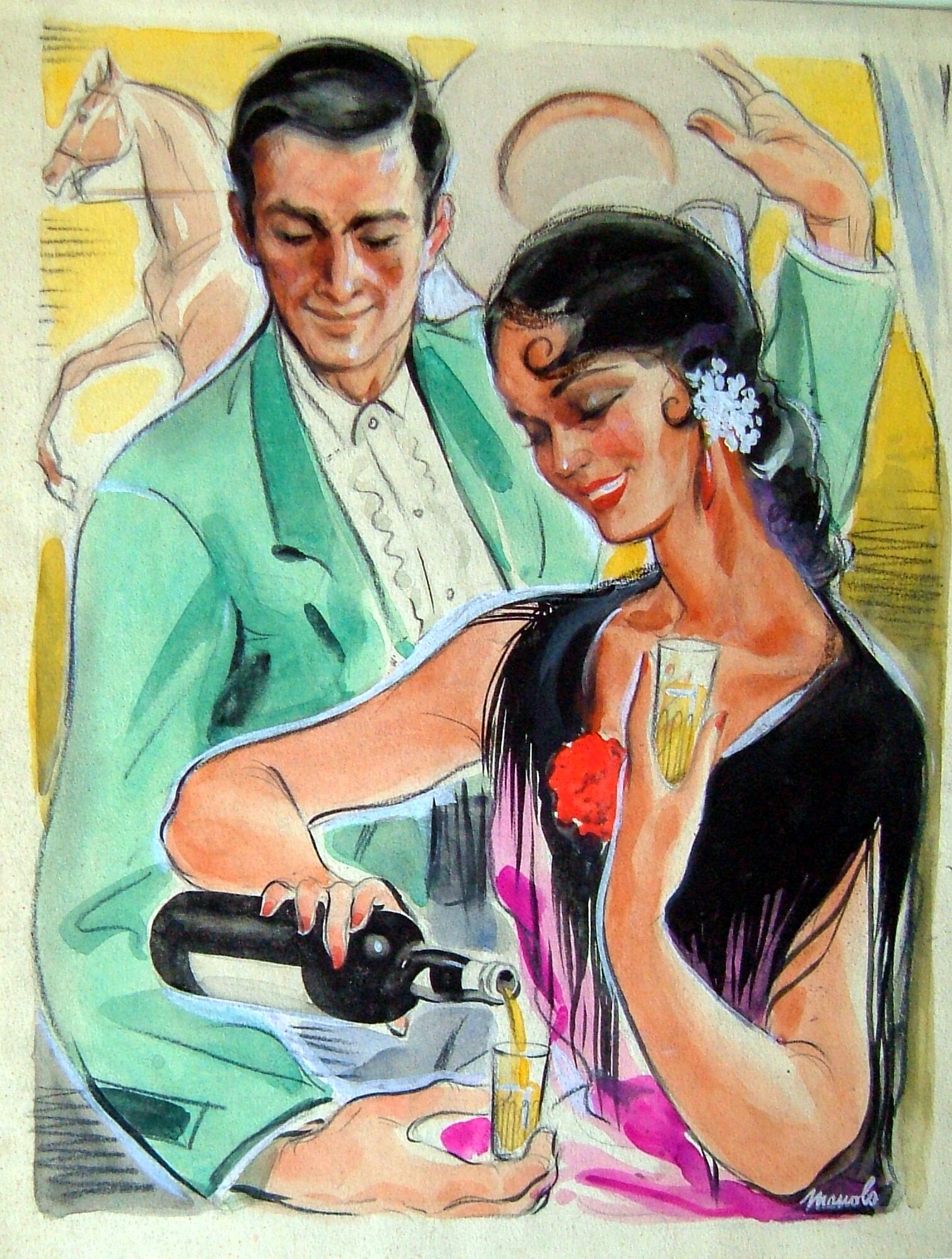 - Cartel que representa a un caballero vestido de corto con chaqueta verde que deja amablemente que le sierva una copa una mujer de pelo moreno con una flor en la oreja, vestida con traje de volantes y mantilla negra que le sirve complaciente, de espaldas a ellos sobre un fondo amarillo la figura de un caballo.