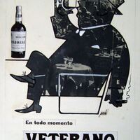 - Perfil de la silueta de un hombre robusto que bebe una copa sentado en una silla con las piernas cruzadas, dentro del caballero se puede apreciar un fondo compuesto por una fotografía con gente en una terraza, debajo se puede leer “en todo momento Veterano Osborne”.