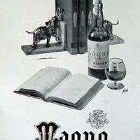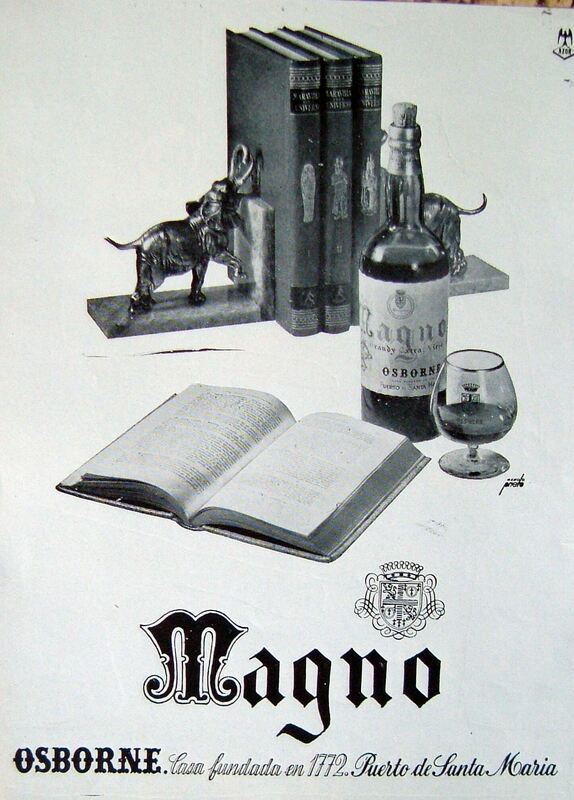 - Cartel con una composición en blancos y negros, en primer término un libro abierto, detrás una botella de Magno y al fondo la imagen de dos sujetas libros en forma de elefantes soportando tres libros.