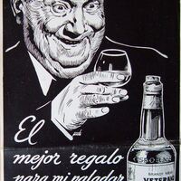 - Sobre un fondo negro, la figura sonriente de un hombre maduro levantando su copa en aptitud de agradecimiento hacia la botella que está frente a él, como brindando alegremente con ella.