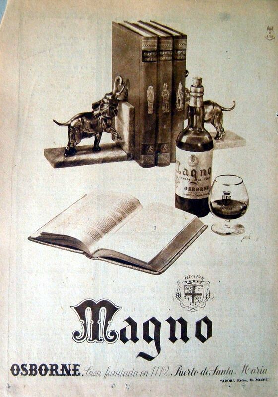 - Cartel con una composición en blancos y negros, en primer término un libro abierto, detrás una botella de Magno y al fondo la imagen de dos sujetas libros en forma de elefantes soportando tres libros.