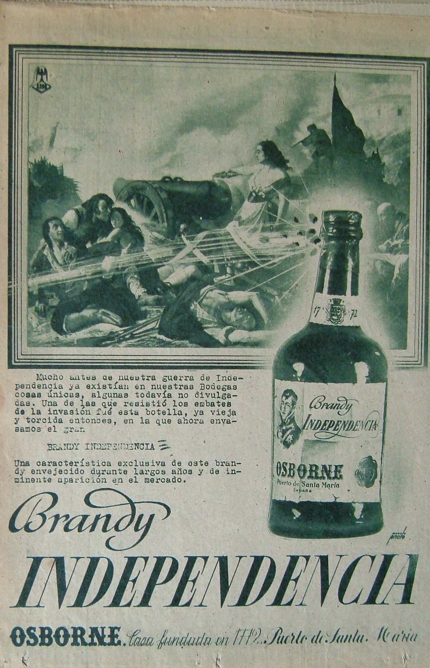 - Imagen con textura de papel de periódico, compuesta por un cuadro que representa una batalla de la guerra de la Independencia, librada contra los franceses, debajo un texto escrito con letras de imprenta a junto la imagen de una botella.
