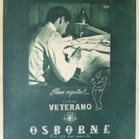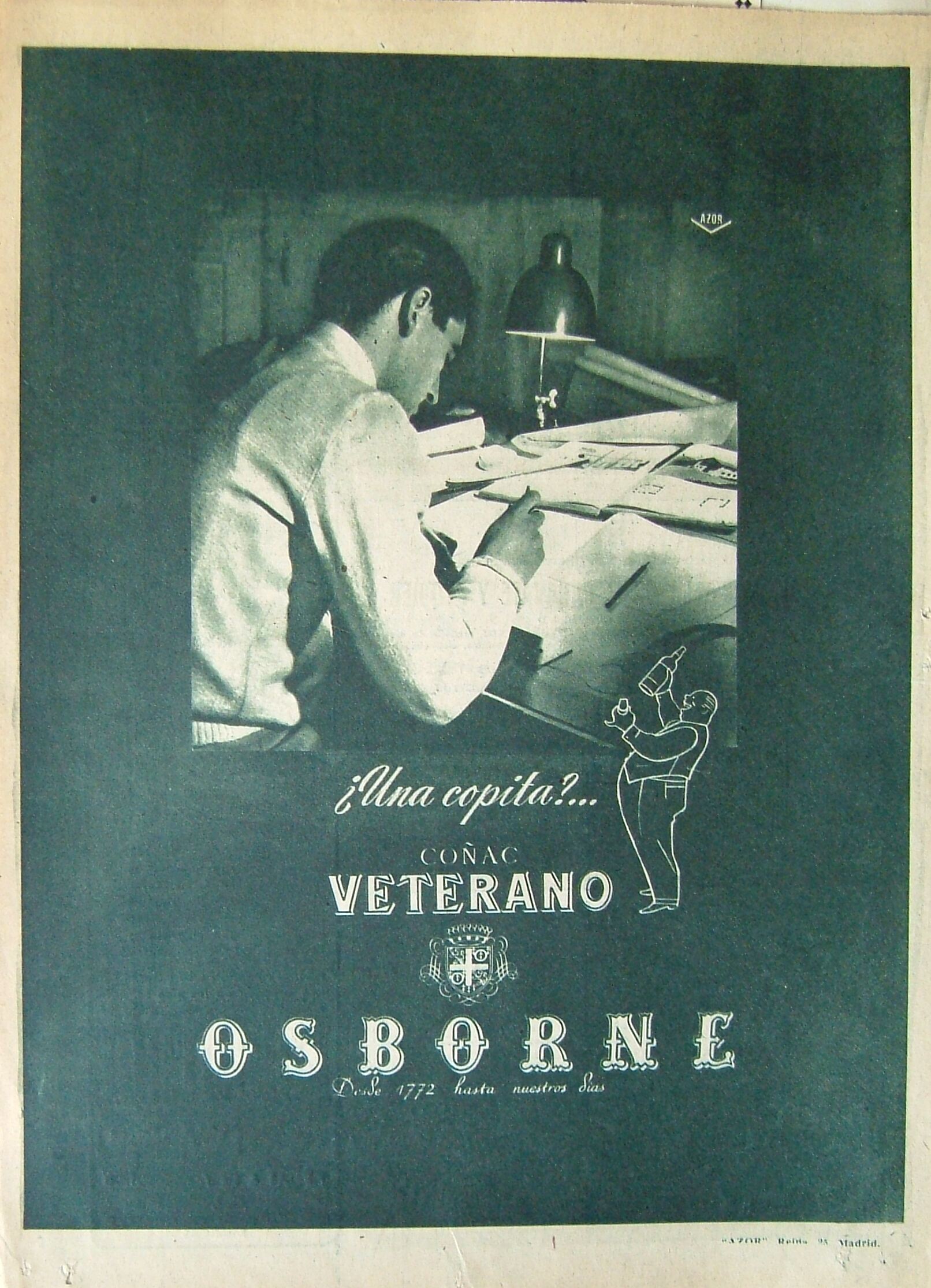 - Cartel compuesto por la imagen real de un arquitecto en mangas de camisa trabajando y proyectando en su tablero, mientras la silueta trazado con líneas blancas le ofrece animadamente una copa.