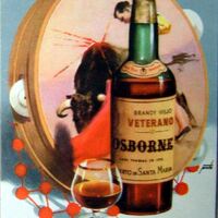 - Cartel compuesto por una superposición de objetos típicos nacionales, al fondo una gran pandereta con la imagen de un toro delante de ella una botella de Veterano Osborne y a su lado una copa, todo ello rodeado por una red goyesca en rojo.