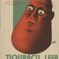 - Sobre un fondo claro, la imagen de una gran cabeza en tonos rojos, exagerando el problema del hipertiroidismo que se refleja en la papada que presenta la figura, en el resto del cartel los rótulos correspondientes a la publicidad anunciada en tonos verdes, rojos y negros.